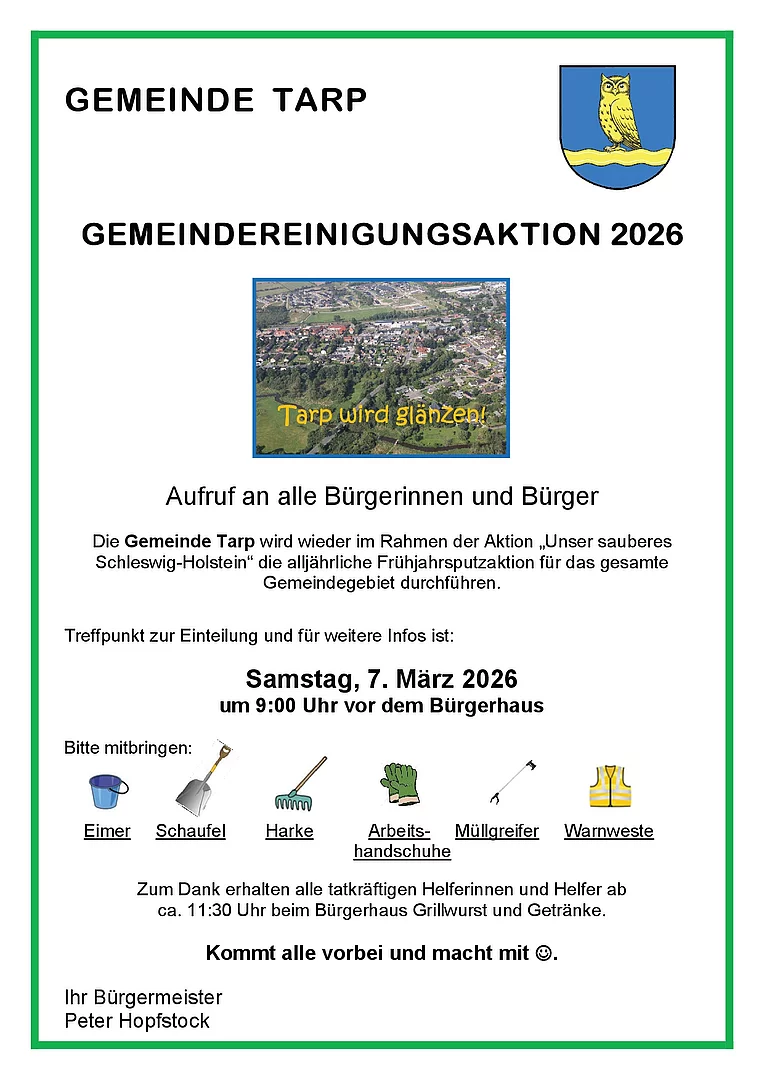 Die Gemeinde Tarp wird im Rahmen der Aktoin "Unser sauberes Schleswig-Holstein" die alljährliche Frühjahrsputzaktion für das gesamte Gemeindegebiet durchführen und ruft zur tatkräftigen Unterstützung aller Bürgerinnen und Bürger auf.